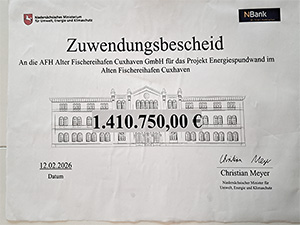 In Anwesenheit des Oberbürgermeister von Cuxhaven, Uwe Santjer, NPorts-Chef Holger Banik und Bürgermeisterin Christine Babacé übergibt der Umweltminister, Christian Meyer, einen Förderbescheid über 1,410.750,00 Millionen Euro an Thomas Wind und Philipp Jouck, den beiden Geschäftsführer der AFH Alter Fischereihafen Cuxhaven GmbH.
